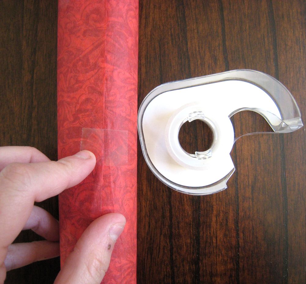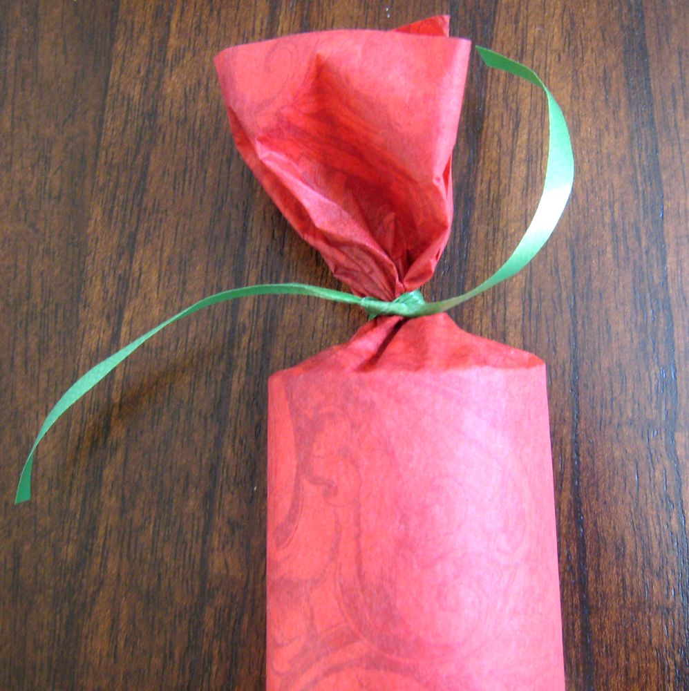 The next steps are pretty simple, stuff your tube with goodies, tape to the edge of a large piece of tissue paper, roll it up, tape off the other edge. I cut each sheet of tissue in half since I didn't really want huge fluffy ends to deal with.