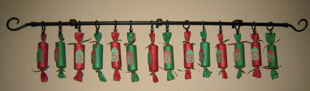 With the help of my friendly neighborhood Dollar Tree, a whole lot of paper towel & toilet tissue rolls, and the already existing art display in my breakfast room, I constructed our countdown calendar for about $7 with a few extra goodies, lots of extra tissue and ribbon!