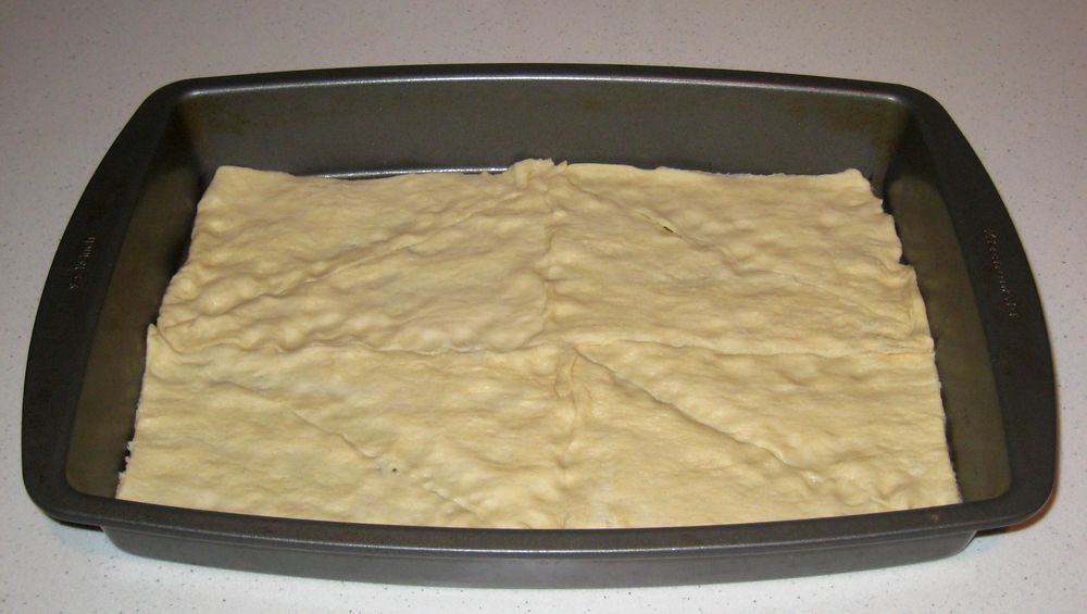 Open one can of crescent rolls and spread across the bottom of a greased 9x13 pan. Flatten a little, pinch the seams, etc to make a semi-smooth bottom crust.