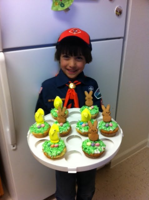 Ben made cupcakes for his Tiger Scout troop's Easter Egg hunt.