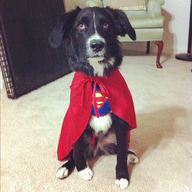 Or should he be Superdog? (Ben is voting for Superdog so I will buy him a Superman costume and they can match. Because every Halloween costume should be chosen to match the family pet.)