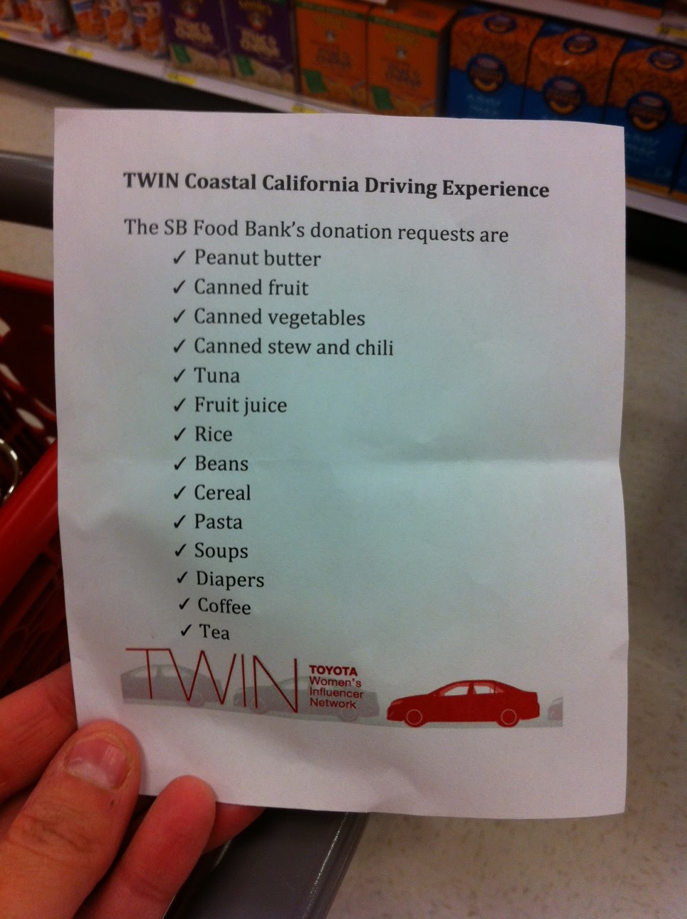 On the first California trip, someone suggested that it would be awesome for TWIN to partner with Toyota at one of their many charitable events. Timing made this difficult, so Toyota created a charity event just for us--donations to the Santa Barbara Food Bank. Along the way from Santa Monica to Santa Barbara, we stopped at Target for a bit of shopping to help out the food bank. Toyota gifted each TWIN with a $25 gift card to help stock the food bank and the manager at Target offered us each a $10 discount on our purchase, so $35 worth of donations per person! Since we had a group somewhere around the 25-30 people mark, that's a whole lot of food!