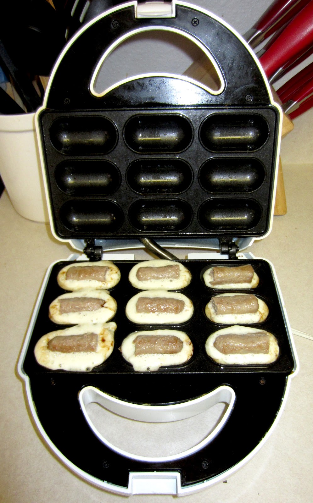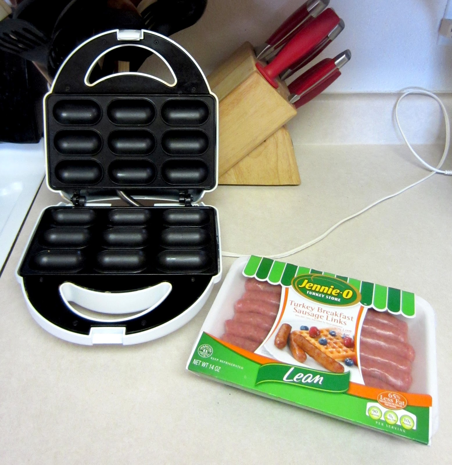 The mini corndog maker was an find of mine a few months ago, for only $5 and shipping. It was a must-have, since I knew I could make healthier corn dogs with it. Even better, the breakfast ones are yummy too and the kids love dipping any kind of food. We picked up our Jennie-O turkey sausage links at Walmart the night before and got to work.