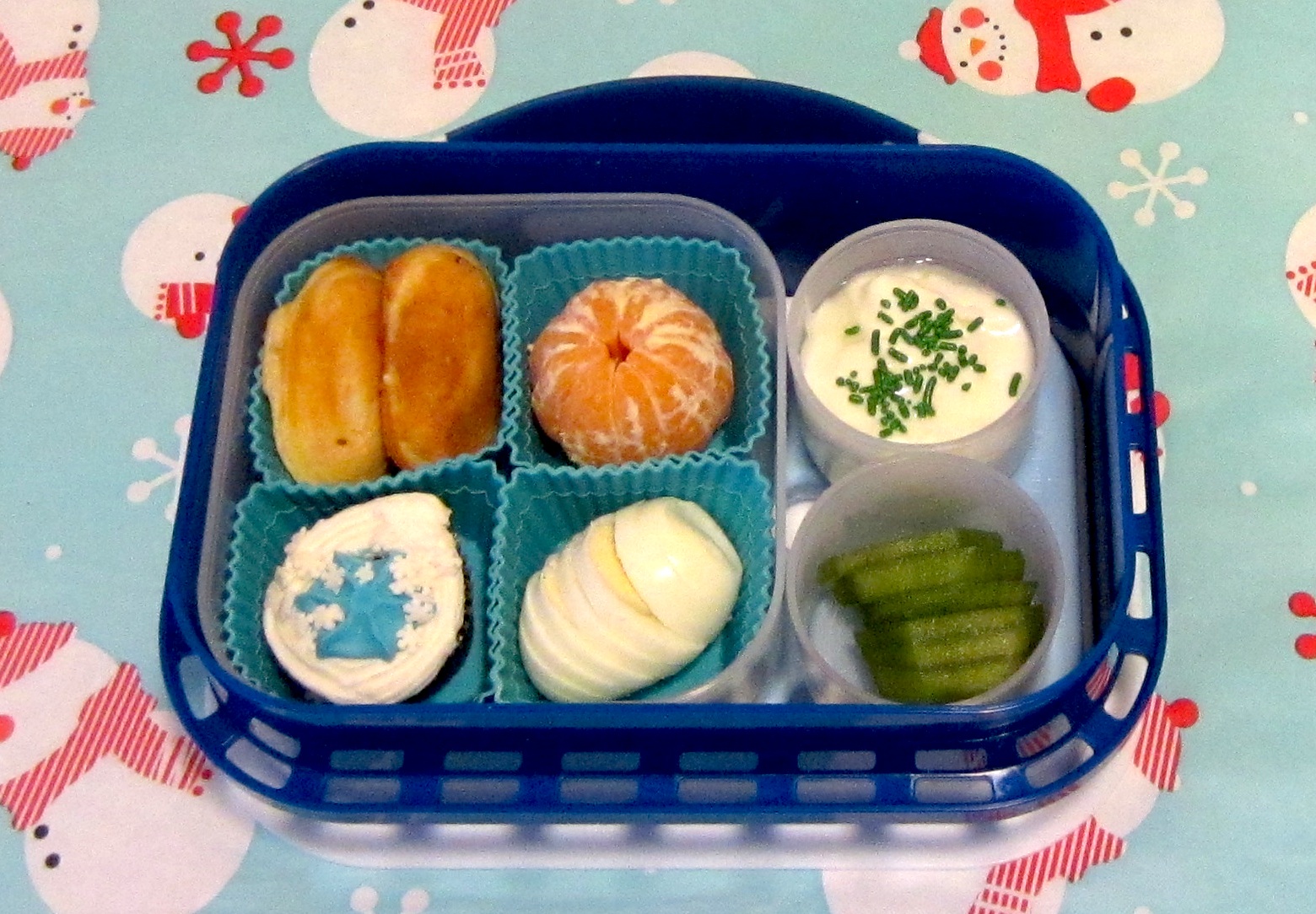Since there were only two of the sausage dogs leftover, we combined them into a breakfast for lunch bento with a boiled egg, kiwi, orange, yogurt, and a mini cupcake as a treat. Apparently, his friend at school thought his lunch was "so cool" and that Ben's mom "is creative." High praise from the second grade set!