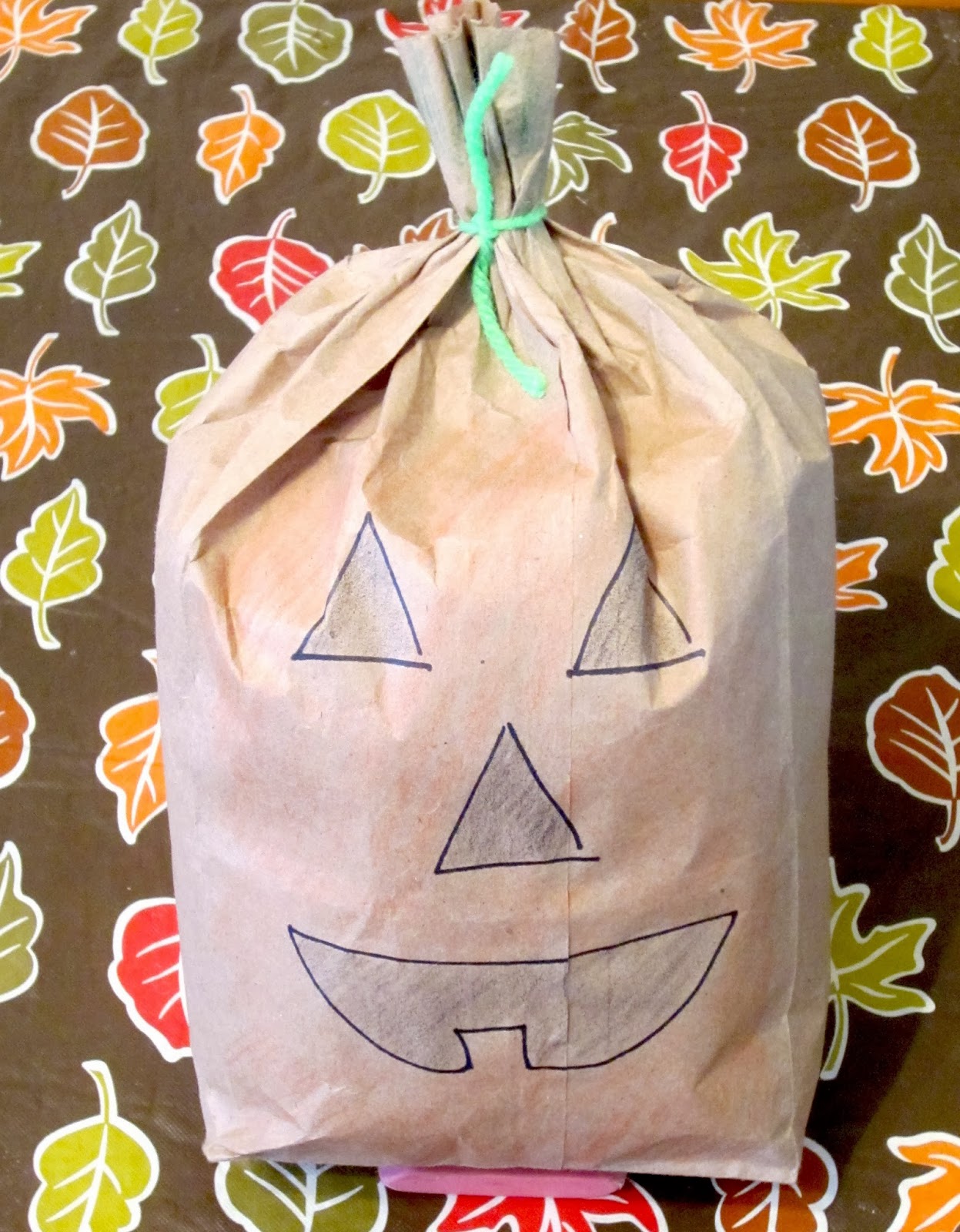 Faith read Say Boo to the little kids and made paper bag pumpkins with them. She used basic brown lunch bags and the kids drew faces on the lower 2/3 of the bag. We crumpled up packing paper (trust me, we have tons of that right now) to stuff in the bag, then tied a bit of yarn around the top to make a little stem.