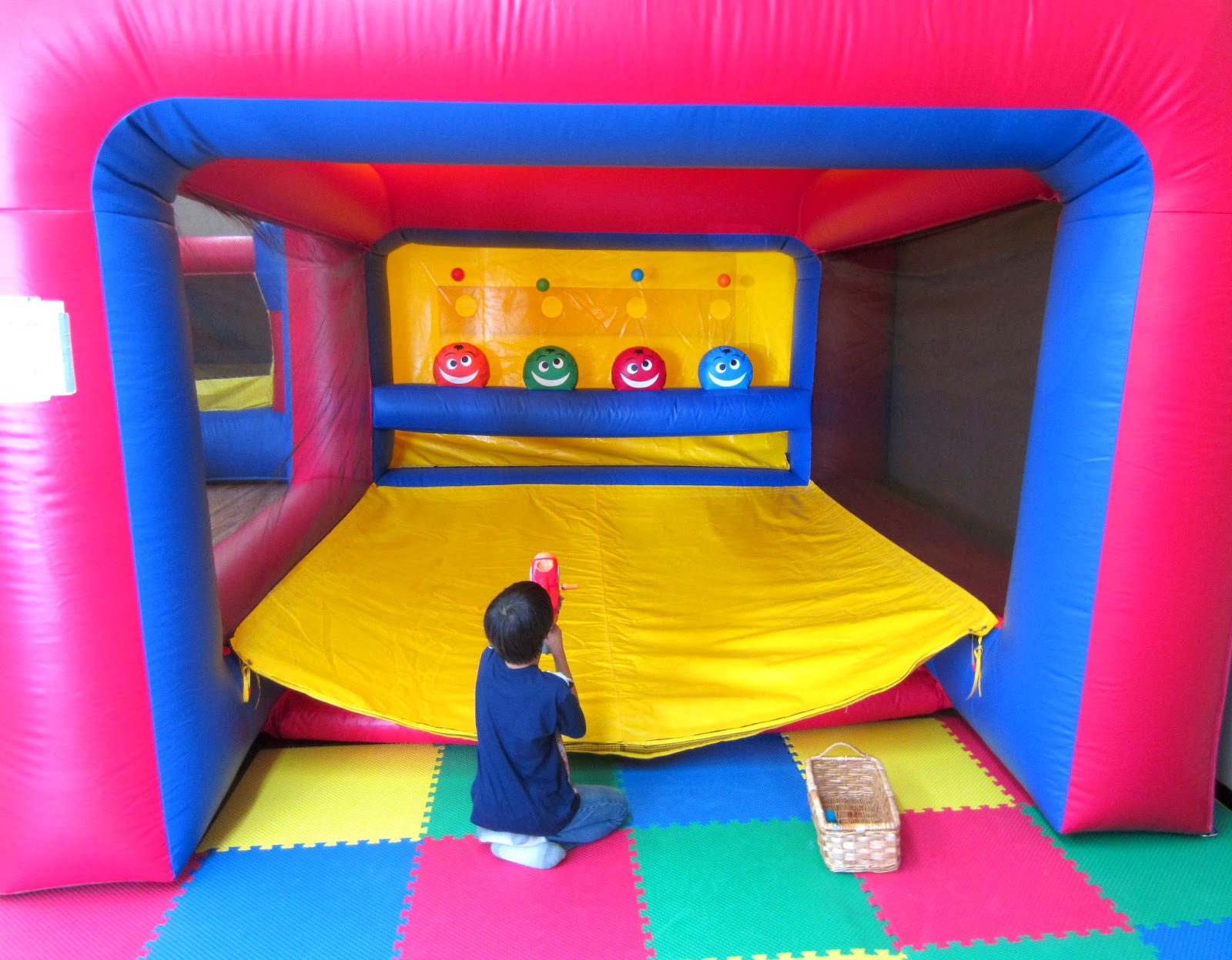 House of Bounce is divided into two areas as they recently expanded into the building next door. The main area includes multiple bounce areas--a big slide and climbing wall combo, a bounce house with a basketball hoop, a velcro wall, a baseball area, and an obstacle course race. There is also a toddler corner specifically for the 3 and under crowd while a second mini bounce house is designated for 4 and under. The second room includes another big slide, a smaller bounce house, a toddler dress up corner, and Ben's favorite, a shooting gallery with balls.