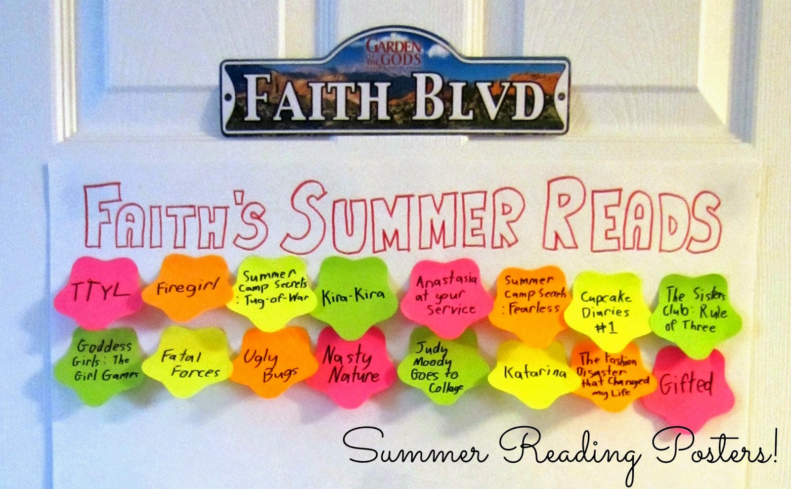 I purchased two sheets of poster board and four packages of assorted colored star-shaped sticky notes. We already had more than enough art supplies at home, so I hand-lettered "Faith's Summer Reads" and "Ben's Summer Reads" at the top. We considered cutting the letters with the Sizzix or Cricut, but simple won out since both of those are in a box in the basement right now.