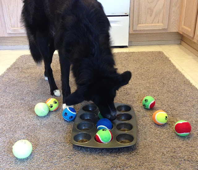- A 12 cup muffin tray - You can buy one specifically for this game. Or you can do what I did and retire an old icky muffin tray to the dog game and buy yourself a nice new one! I like to bake, so I had plenty of old muffin trays that could easily be repurposed for the dog to use. Just be sure to label it as "Dog Tray"!