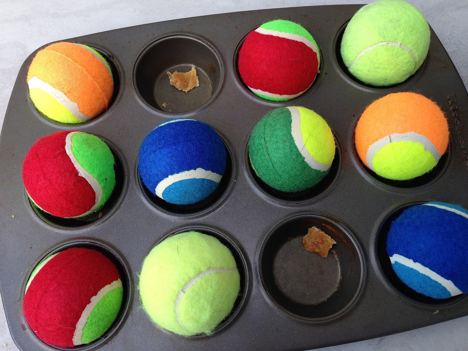 Once you have your treats cut up, place one at the bottom of each muffin cup. Place the tennis balls on top of *most* of the cups. If you're teaching the game, leave at least 3-4 holding just the treats with no tennis balls.